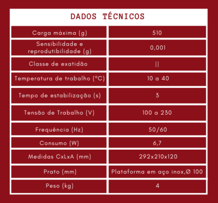 Balança eletrônica com capacidade de 510g, precisão de 0,001g, com microprocessador, tara subtrativa em toda a escala e com protetor circular de vento metálico.